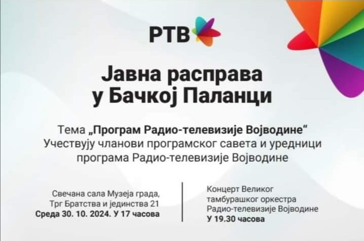 U  svečanoj sali muzeja grada Bačka Palanka u sredu 30. oktobra sa početkom u 17.00 časova biće održana javna rasprava na temu “Program Radio-televizije Vojvodine”.