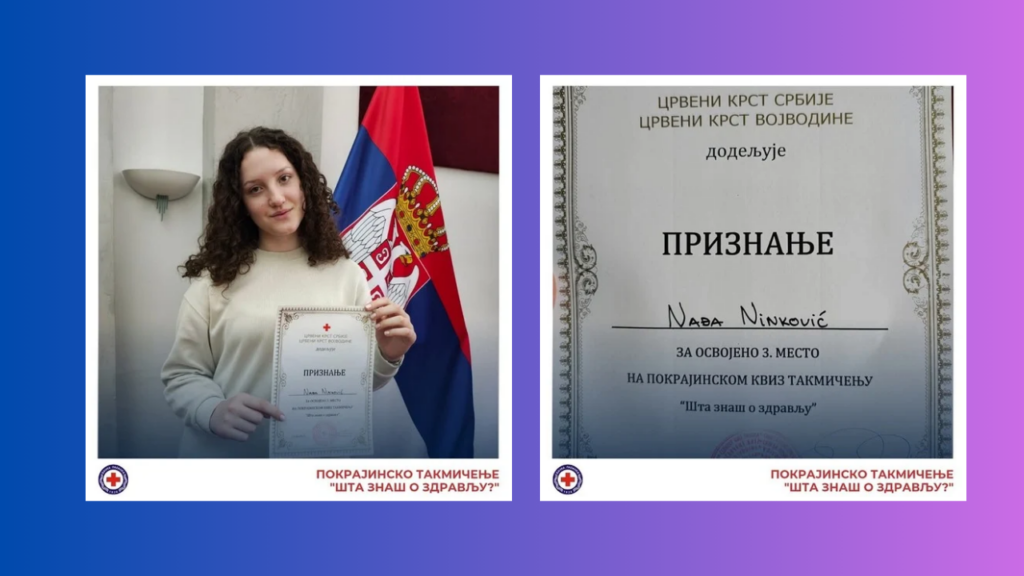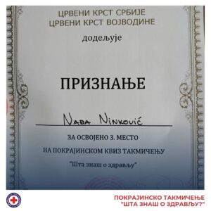 Ona je pokazala izuzetno znanje i osvojila je treće mesto. Crveni krst Bačka Palanka upućuje joj čestitke na postignutim rezultatima.