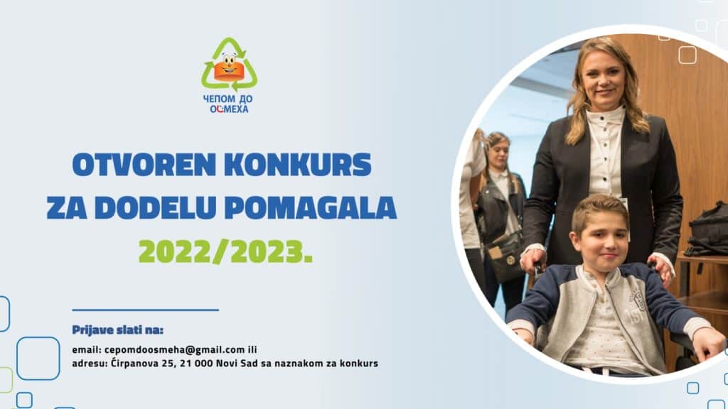 Хуманитарно-еколошка организације “Чепом до осмеха” отвара конкурс за родитеље, старатеље или хранитеље да пријаве своје дете којем је потребно помагало. Удружење „Чепом до осмеха“ је решило да прошири листу деце којој су до сада помогли, јер ће прилику да добију помагало имати малишани широм Србије.