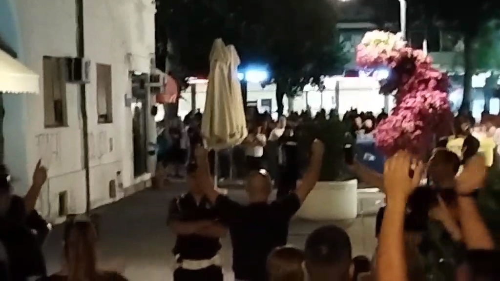 Šačica njih, skrivena iza kontejnera, jedino što može jeste da iz daljine dobacuje, dok pristalice vlasti, ubedljivo brojnije, pesmom i snagom zajedništva brane prostorije.