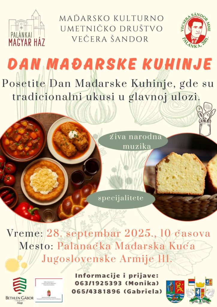 Mađarsko kulturno-umetničko društvo „Večera Šandor“ organizuje manifestaciju Dan mađarske kuhinje, koja će biti održana u nedelju, 28. septembra 2025. godine, sa početkom u 10 časova, u Palančkoj Mađarskoj kući (ulica Jugoslovenske Armije 111).