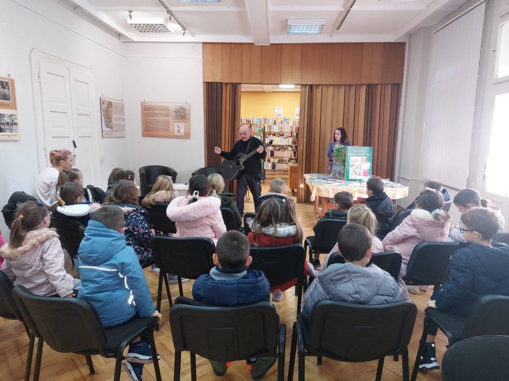 Govorio im je o tome kako nastaju pesme i priče, te kako se „prave“ knjige koje žive u bibliotekama i čekaju decu da ih odnesu u svoje domove i druže se sa njima. Potom je pevao i svirao svoje pesme za decu.