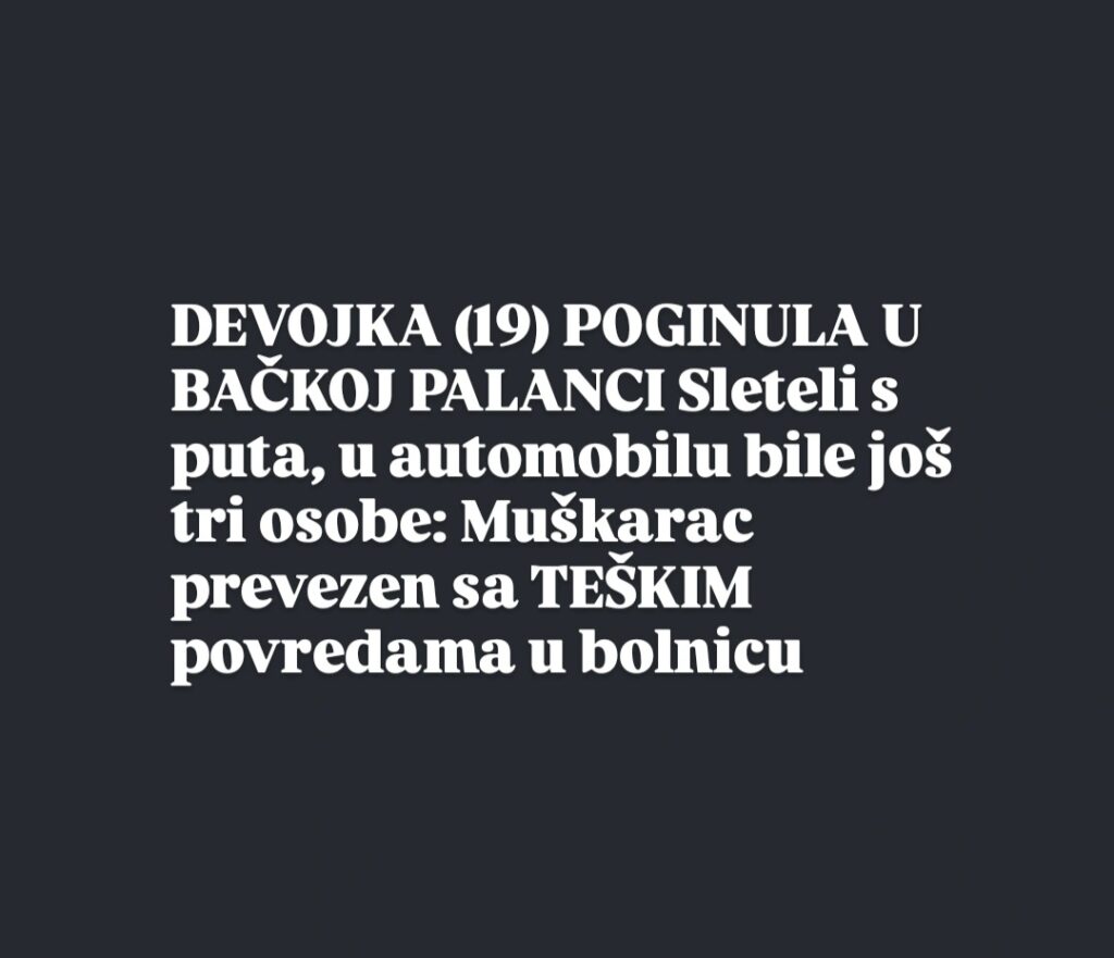 M.P. (19) poginula je u teškoj saobraćajnoj nesreći koja se dogodila večeras oko 20.30 časova, na Obrovačkom putu kod naselja Telep u Bačkoj Palanci.