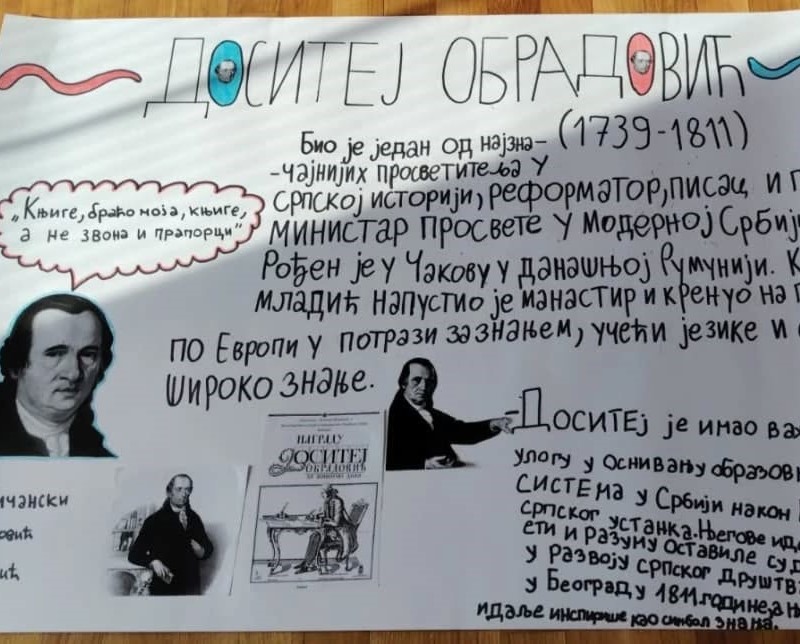 Učenici OŠ “Vuk Karadžić” su pravili plakate o životu i delu Dositeja Obradovića i narodnim umotvorinama koje je Dositej sačuvao od zaborava, učestvovali u radionicama..