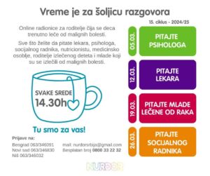 Kroz projekat „Vreme za šoljicu razgovra“ Nurdor pruža korisne informacije roditeljima vezane za lečenje dečjeg maligniteta, uz slobodne i otvorene razgovore umanjuju se stresni doživljaji kojih je u dugotrajnom procesu lečenja veoma mnogo a koji mogu negativno da utiču na ishod bolesti.