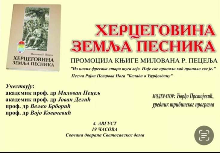 U svečanoj dvorani Svetosavskog doma u Gajdobri, u nedelju 4. avgusta biće upriličena promocija knjige Milovana R. Pecelja “Hercegovina zemlja pesnika”.
