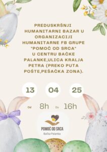u organizaciji humanitarne FB grupe “Pomoć od srca” održaće se u centru Bačke Palanke, ulica Kralja Petra (preko puta Pošte, pešačka zona),