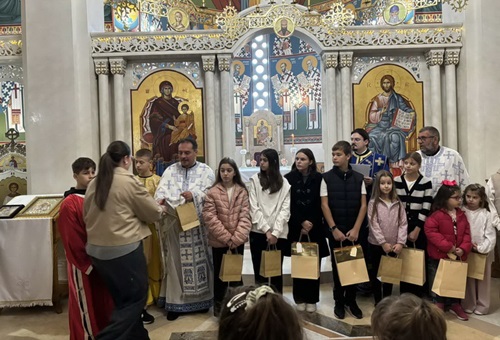 Posle svete Liturgije, u priprati hrama su izloženi najuspešniji radovi učesnika likovnog konkursa za učenike osnovnih škola u opštini Bačka Palanka na temu „Zadužbine Nemanjićaˮ i dodeljene nagrade autorima najboljih likovnih radova. Potom su dodeljene nagrade autorima najboljih literarnih radova na temu „Kaligrafski motivi (Prvi vaseljenski sabor, Simvol vere, Hristov monogram)ˮ koji su pristigli na konkursu koji je bio raspisan za učenike bačkopalanačkih srednjih škola. Navedeni konkursi za učenike osnovnih škola i srednjih škola raspisani su u okviru duhovnih svečanosti „Pod Pokrovom Bogorodiceˮ, koje se održavaju u danima pred proslavu prestonog praznika hrama Pokrova Presvete Bogorodice u bačkopalanačkom naselju Sinaj.