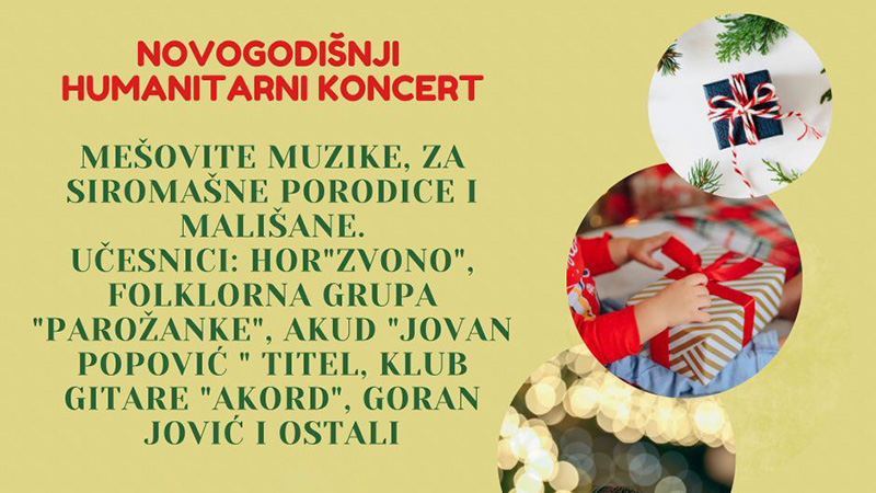 Novogodišnji humanitarni koncert mešovite muzike za siromašne porodice i mališane biće održan u Muzeju grada 16. decembra sa početkom u 18.00 časova pod nazivom “Jedan poklon menja svet jednog deteta”.