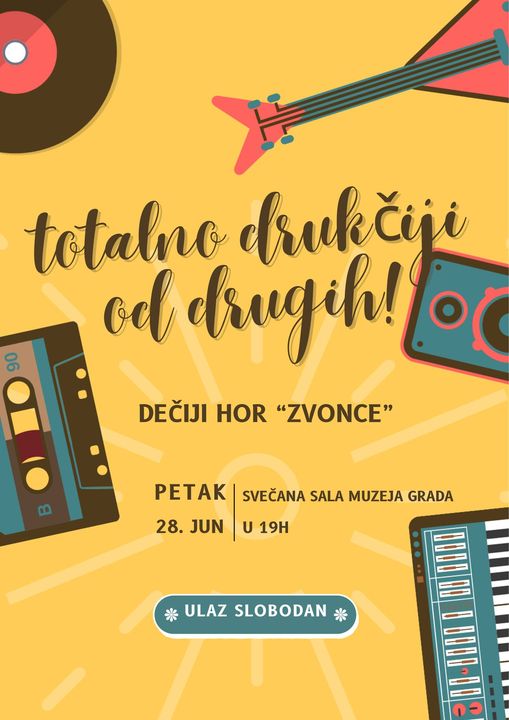 Koncert Kulturnog kluba „Zvono“ – dečijeg hora “Zvonce” pod nazivom „Totalno drukčiji od drugih“ biće održan u petak 28. juna u Muzeju grada sa početkom u 19 časova.