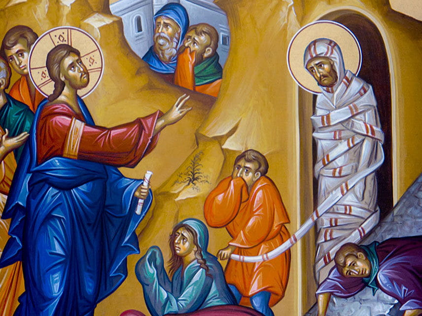 Prema Jevanđelju po Jovanu, na vest o Lazarevoj smrti, Isus Hrist je došao u Vitiniju gde je njegov prijatelj već četiri dana bio sahranjen. Došao je do groba i zatražio da se skloni kamen. Pozvao je Lazara da izađe i ovaj je to učinio, uvijen u pogrebni pokrov.