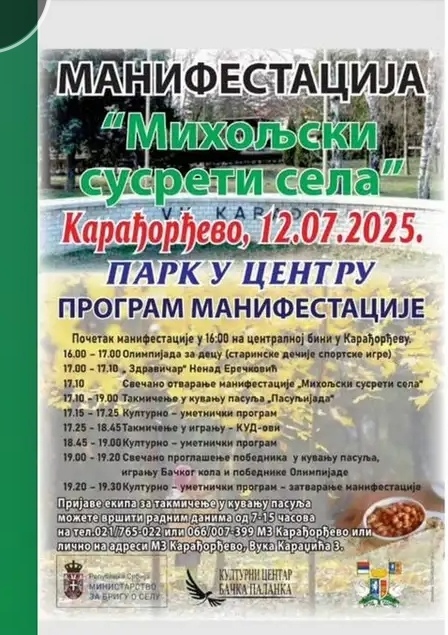 U subotu 12. jula sa početkom u 16 časova biće održana manifestacija „Miholjski susreti sela“ . Ove godine manifestacija će biti održana u Karađorđevu.