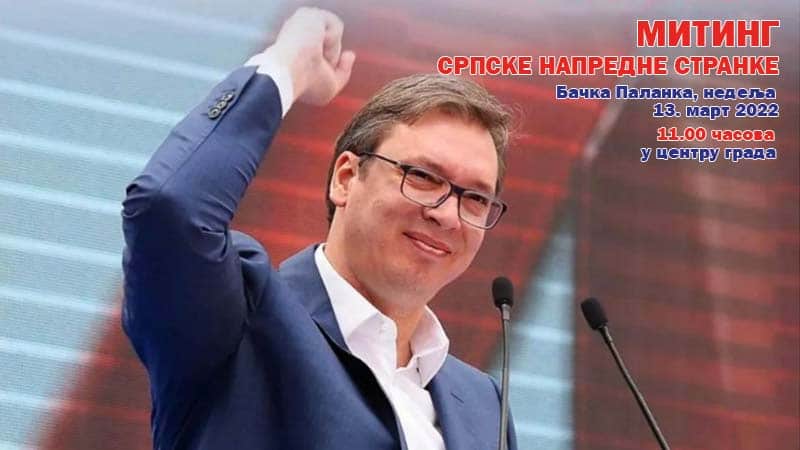 Предизборни скуп Српске напредне странке на којем ће говорити председник СНС Александар Вучић биће одржан у недељу 13. марта у Бачкој Паланци, улица Краља Петра Првог са почетком у 11.00 часова.