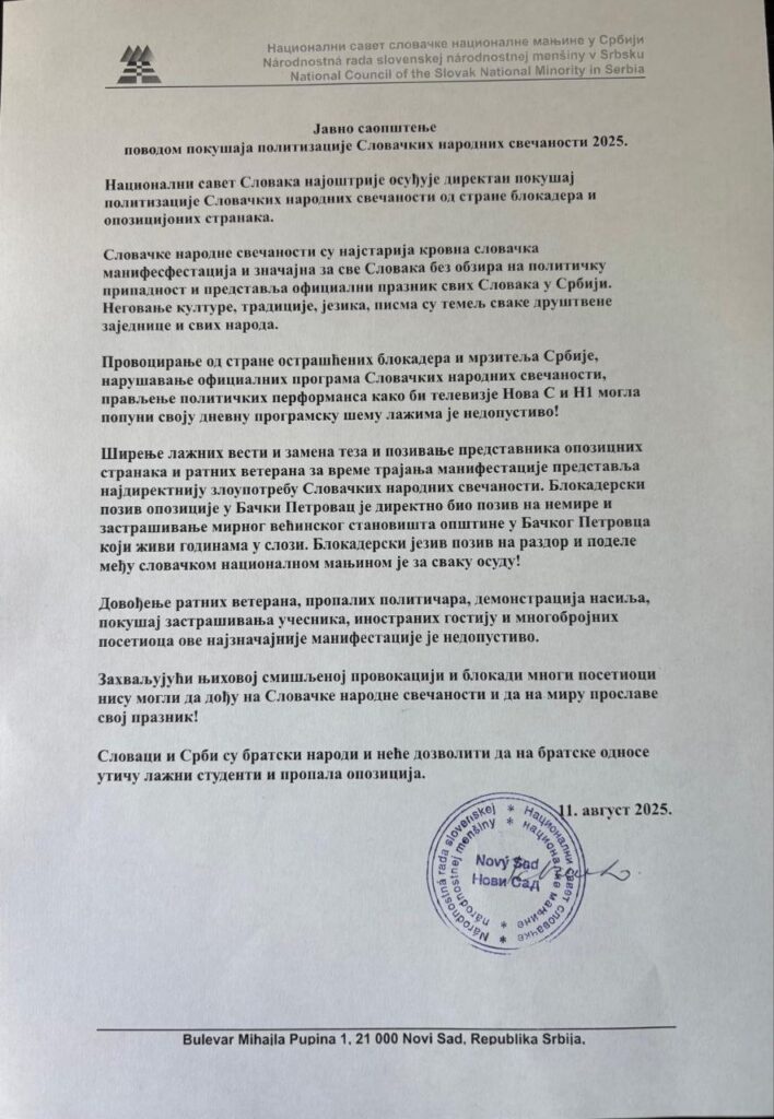 -Povodom pokušaja politizacije Slovačkih narodnih svečanosti 2025. godine, Nacionalni savet Slovaka najoštrije osuđuje direktan pokušaj politizacije ove manifestacije od strane blokadera i opozicionih stranaka. Slovačke narodne svečanosti su najstarija krovna slovačka manifestacija, značajna za sve Slovake, bez obzira na političku pripadnost, i predstavljaju zvanični praznik svih Slovaka u Srbiji. Negovanje kulture, tradicije, jezika i pisma predstavlja temelj svake društvene zajednice i svih naroda. Provociranje od strane ostrašćenih blokadera i mrzitelja Srbije, narušavanje zvaničnog programa Slovačkih narodnih svečanosti i pravljenje političkih performansa, kako bi televizije Nova S i N1 mogle da popune svoju dnevnu programsku šemu lažima, je nedopustivo!