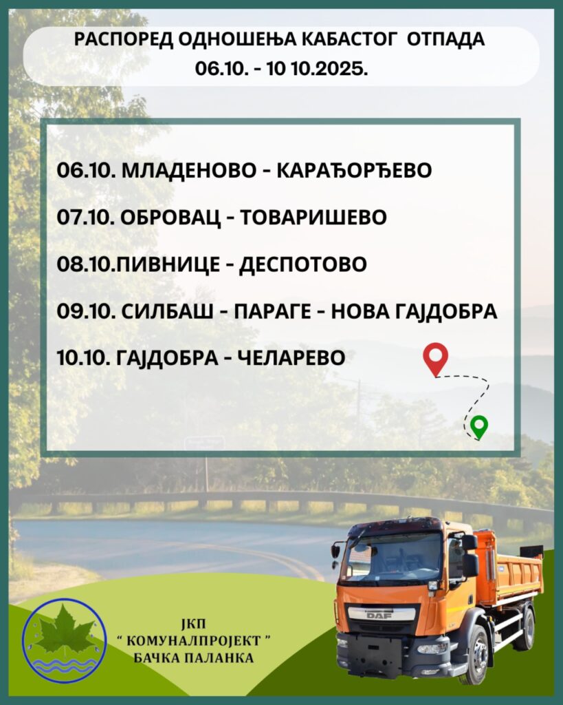JKP „Komunalprojekt“ obaveštava građane da će se u narednom periodu vršiti odnošenje kabastog otpada po selima, i to prema sledećem rasporedu: