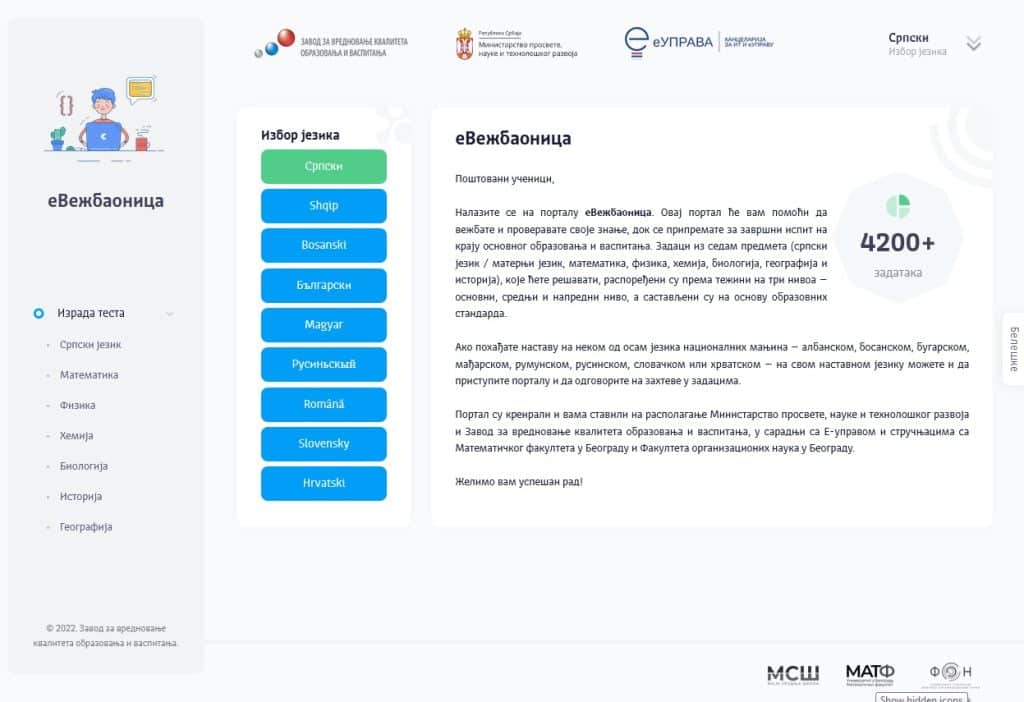 За подршку ученицима осмог разреда у припреми за завршни испит Министарство просвете, науке и технолошког развоја и Завод за вредновање квалитета образовања и васпитања, покренули су нови портал еВежбаоница (evezbaonica.zvkov.gov.rs) на коме ученици могу да решавају задатке и провере своје знање.