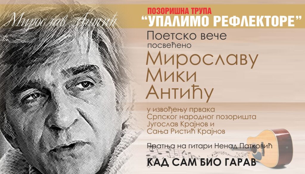 U Gradskom bioskopu 28. novembra u 20.00 časova biće održano poetsko veče posvećeno Miroslavu Miki Antiću u izvođenju prvaka Srpskog narodnog pozorišta Jugoslava Krajnova i Sanje Ristić Krajnov.