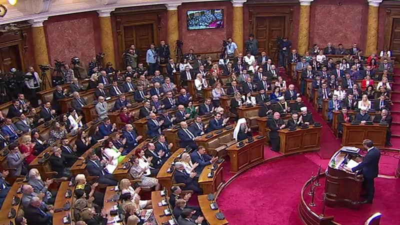 Након тога, потписао је текст заклетве, а посланици и гости поздравили су га аплаузом, након чега је уследила химна Србије “Боже правде”.