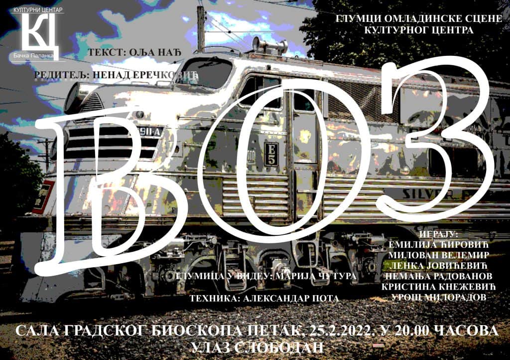 У Градском биоскопу у петак 25. фебруара у 20.00 часова биће одиграна позоришна представа „Воз“ у извођењу глумаца омладинске сцене Културног центра.