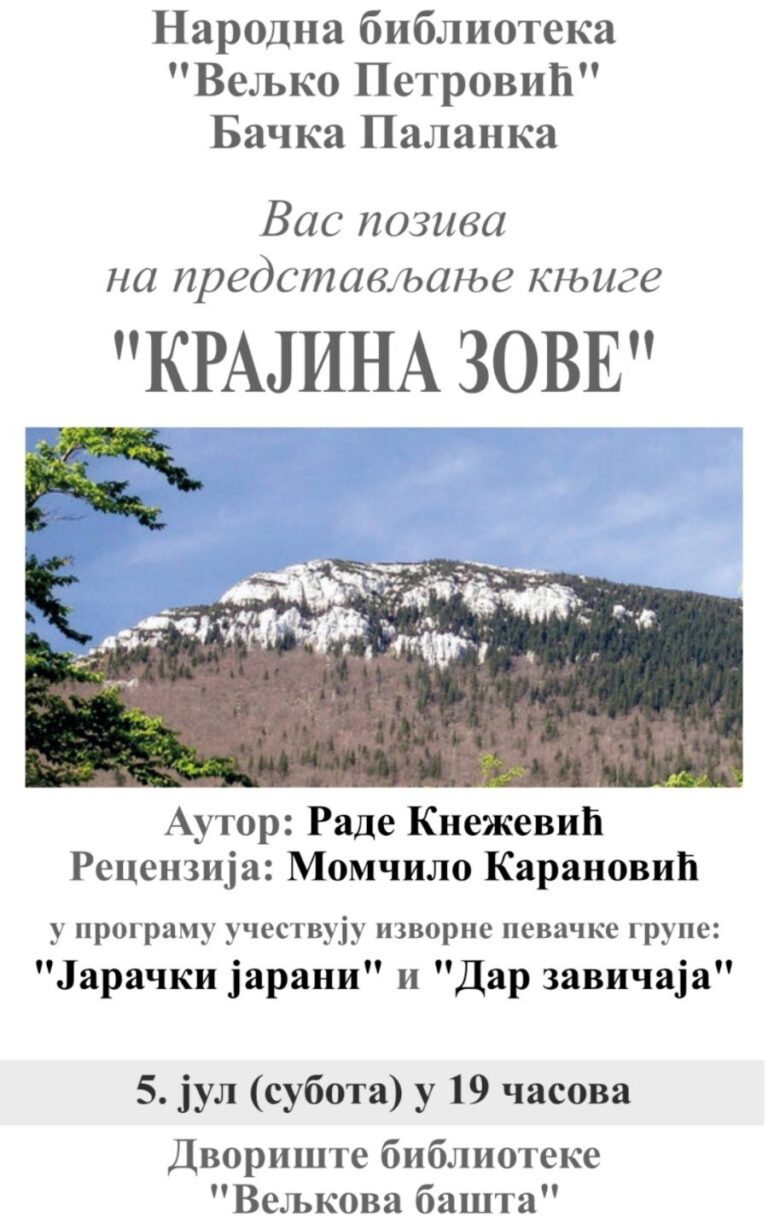 Promocija knjige “Krajina zove” autora Radeta Kneževića, biće održana u subotu, 05. jula, u dvorištu biblioteke “Veljko Petrović” u “Veljkovoj bašti”, sa početkom u 19 časova. Do sada je objavio osam knjiga, sedam zbirki pesama i roman.