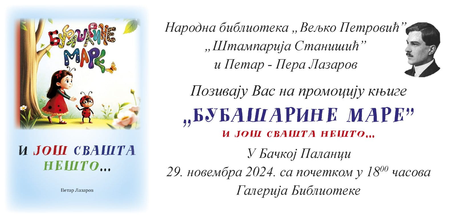U petak 29.novembra 2024. u 18 časova, u velikoj sali biblioteke, održaće se promocija zbirke dečijih pesama sa slikovnicom pod nazivom „Bubašarine mare“ autora Petra Lazarova.