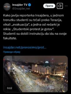Kako javlja reporterka Insajdera, u jednom trenutku studenti su trčali preko Terazija, vikali „evakuacija“, a jedna od redarki je rekla: „Studentski protest je gotov“. Studenti su dobili instrukciju da idu na svoje fakultete – stoji u objavi Insajder TV.