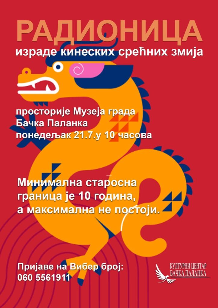 Kulturni centar Bačka Palanka organizuje kreativnu radionicu izrade kineskih srećnih zmija, koja će se održati u prostorijama Muzeja grada Bačka Palanka, u ponedeljak, 21. jula sa početkom u 10 časova.