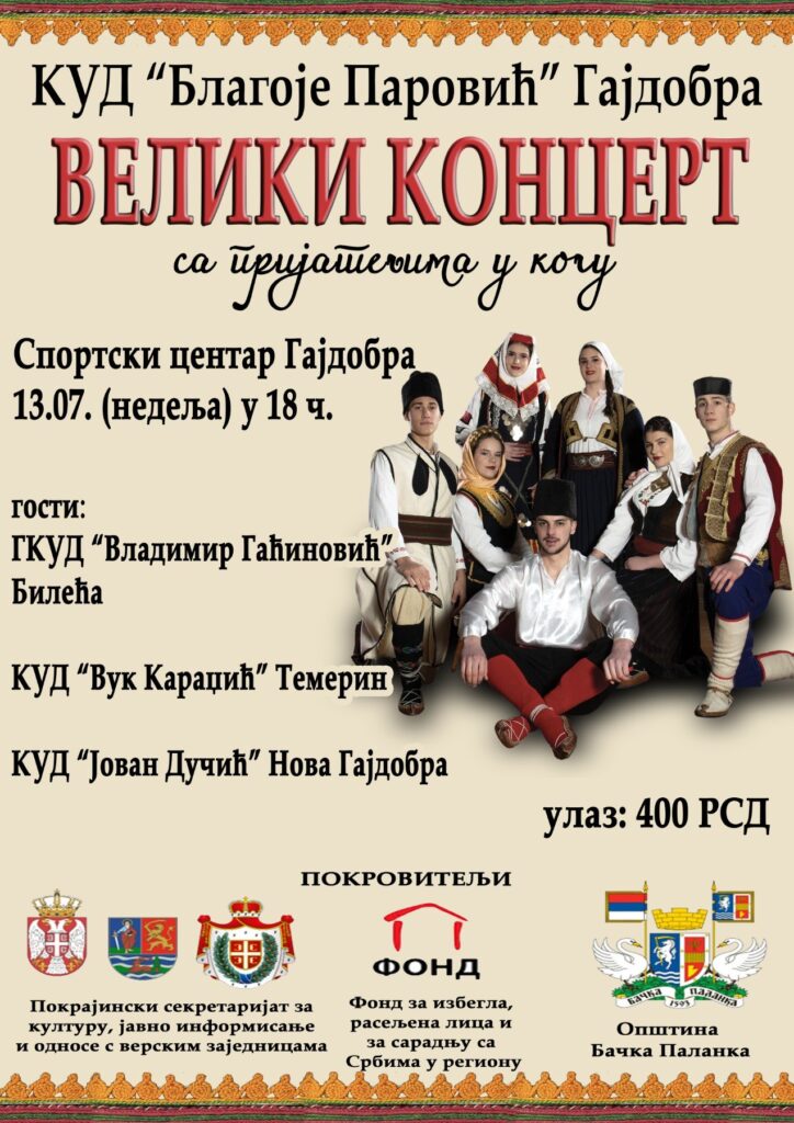 U nedelju, 13. jula u sportskom centru u Gajdobri biće održan veliki koncert KUD-a „Blagoje Parović“ pod nazivom „Sa prijateljima u kolu“.