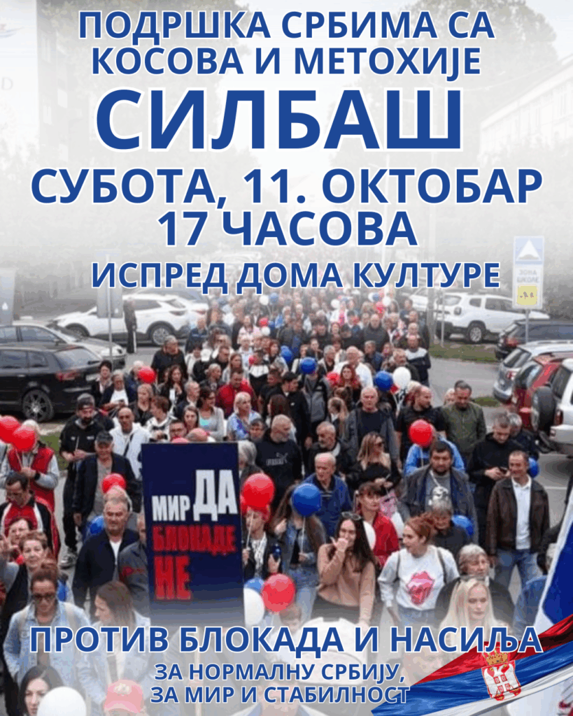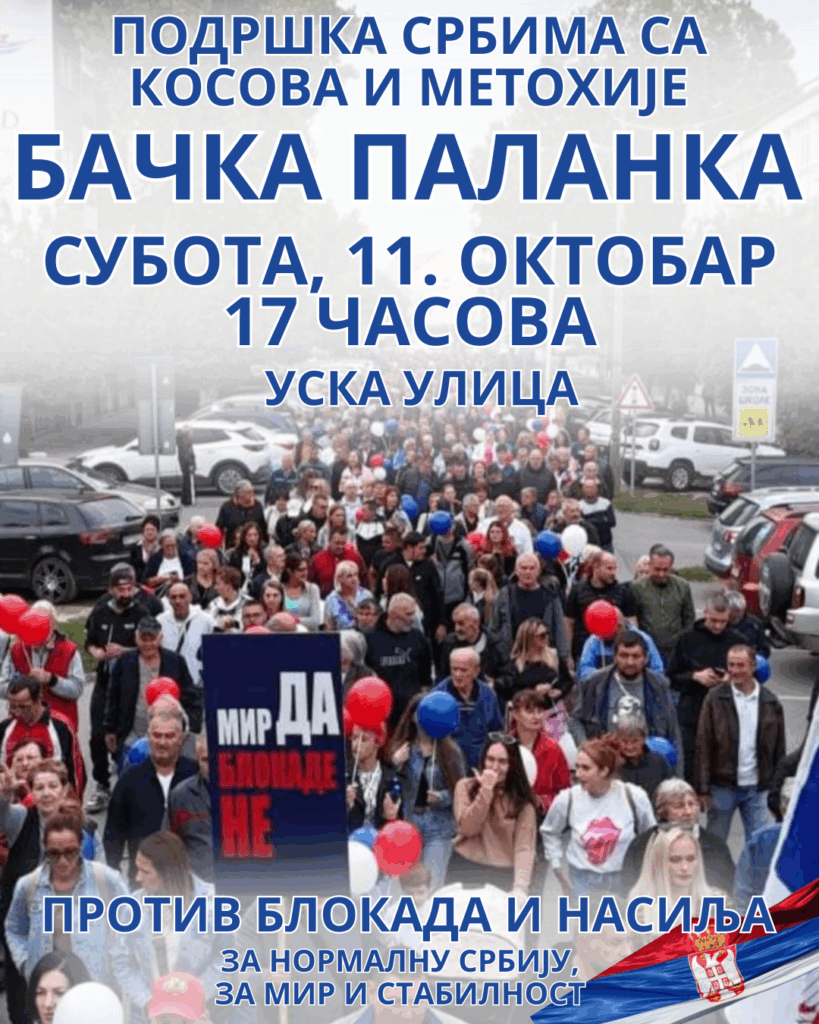 U subotu, 11. oktobra, u 17 časova, biće održani skupovi podrške Srbima sa Kosova i Metohije — u Bačkoj Palanci (Uska ulica) i u Silbašu (ispred Doma kulture).