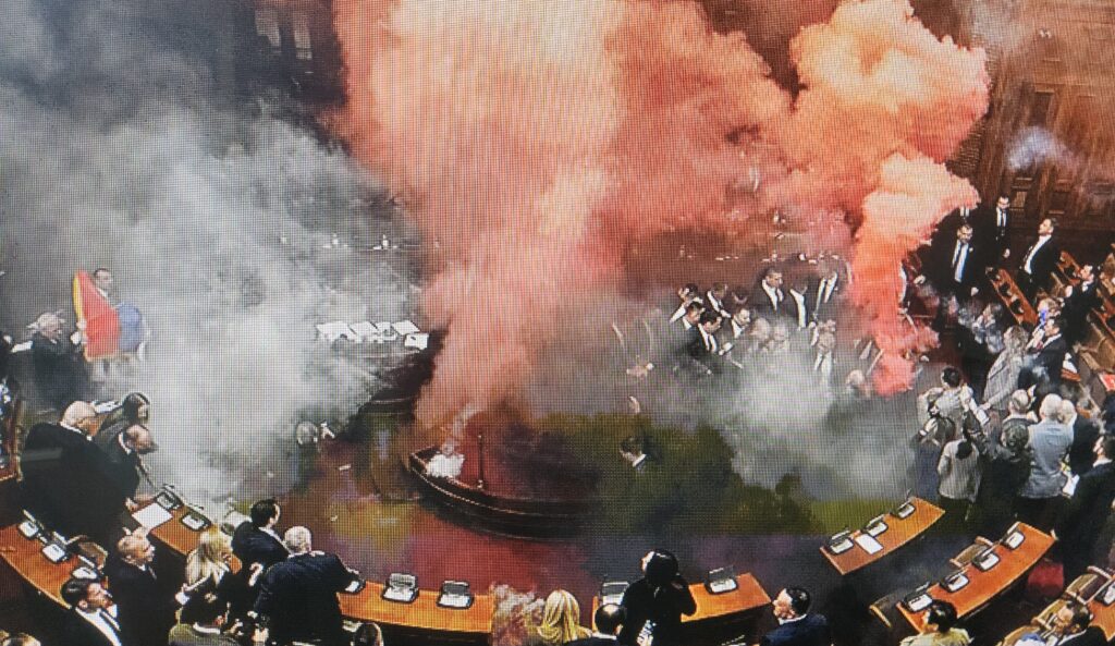 Juriš opozicije iz klupa na podijum usledio sekund pošto je utvrđen dnevni red današnje sednice. Prvo su izleteli iz klupa pred sto predsedavajuće a onda je usledio opšt haos sa dimnim bombama koji podseća na svojevremene scene iz prištinske skupštine.