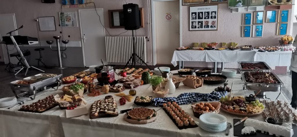Prijatnu i domaćinsku atmosferu povodom proslave dana škole upotpunilo je raznovrsno i bogato posluženje koje su pripremili zaslužni učenici ove škole, kuvari, poslastičari i konobari zajedno sa svojim profesorima.