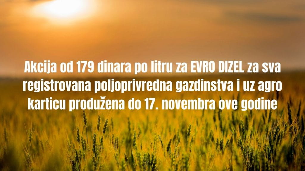 Akcija od 179 dinara po litru za EVRO DIZEL za sva registrovana poljoprivredna gazdinstva i uz agro karticu produžena do 17. novembra ove godine