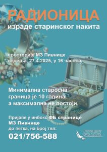 Kulturni centar Bačka Palanka u saradnji sa MZ Pivnice organizuje kreativnu radionicu izrade starinskog nakita, koja će se održati u nedelju, 27. aprila 2025. godine, sa početkom u 16 časova, u prostorijama Mesne zajednice Pivnice.