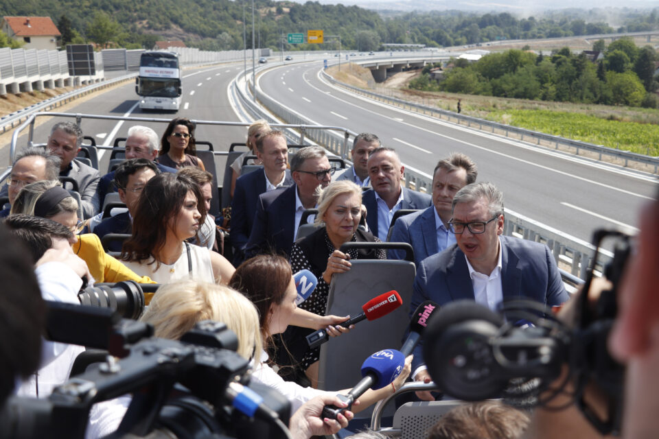 U autobusu sa Vučićem i predstavnicima medija su i ministarka građevinarstva Aleksandra Sofronijević, ministar za javna ulaganja Darko Glišić, ambasador Kine Li Ming, direktori Puteva Srbije i Koridora Srbije Zoran Drobnjak i Aleksandar Antich.