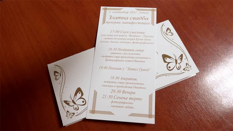 Учесници овогодишње Златне свадбе прошетаће центром града у петак у 17 часова, а у Сали за венчање у згради општине подсетиће се на завете које су једно другом дали пре 50 година. Након тога ће у Гранд хотелу имати свечану вечеру и забаву.